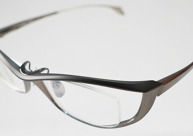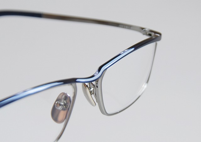 クラシカルとアバンギャルドという、相反するデザインを融合することを目指したモデルがJN-653。フレームの厚みを少しずつ変化させたり、カッティングを施すことでこの相反する2つのデザインを表現しています。一番薄いところでは0.8㎜というβチタン加工の極限の薄さにすることで適度なバネ性も生まれ、掛け心地も魅力の一本になっています。