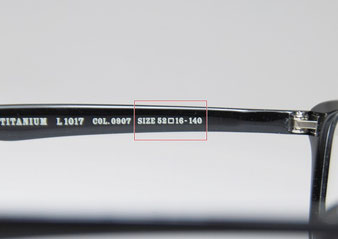 まず、サイズがどこに明記されているか?ですが、ほとんどのメガネがテンプルと呼ばれる耳を掛ける腕の部分に記載されていることが多いです。
