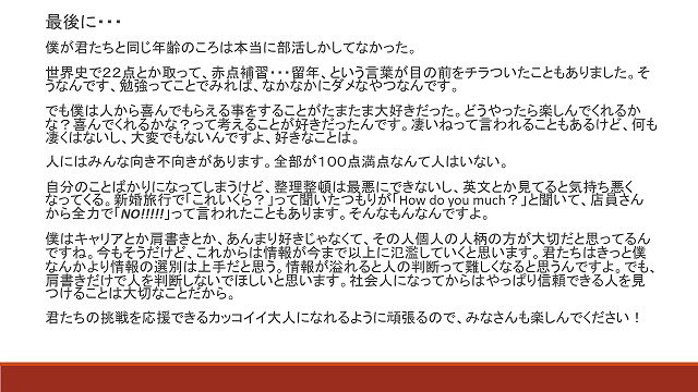 信じられないかもしれないけど、今やっていることは必ず後で活かせます。授業にも無駄なものは何も無いと思っていいです。